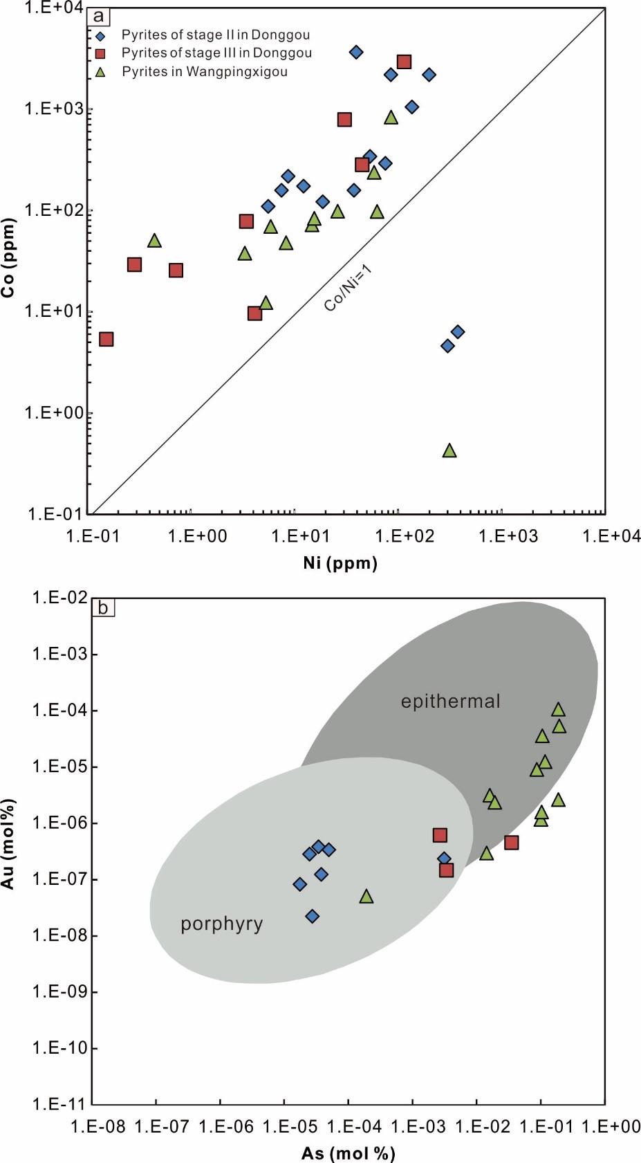 通过前期的调研发现,付店矿集区发育有大量的铅锌矿,这些铅锌矿围绕着东沟钼矿分布(图2)。其中,王坪西沟铅锌矿是区内最大的铅锌矿,并且其成矿时代与东沟钼矿一致。基于此,中国科学院广州地球化学研究所矿物学与成矿学实验室研究员赵太平及其博士研究生金昌等人,选取这两个矿床作为研究对象,探讨铅锌矿和钼矿之间的成因关系。基于野外和镜下观察,识别出王坪西沟铅锌矿矿化作用分为三个阶段,而东沟钼矿矿化作用分为四个阶段。通过对王坪西沟第二阶段和东沟第二和三阶段硫化物的微区地球化学研究,发现从东沟钼矿到王坪西沟铅锌矿,其微量元素具有线性分布的特点,并且符合从斑岩到浅成低温热液系统的演化特点(图3)。另外,两个矿床的硫化物与东沟斑岩具有相似的Pb同位素特征(图4)。结合两个矿床具有相似的成矿时代,研究人员认为王坪西沟铅锌矿为东沟斑岩钼矿远端的产物,二者为一个成矿系统,这为今后的找矿工作提供了一些较好的思路。该区众多铅锌矿(沙沟、蒿坪沟以及铁炉坪等)呈离散型分布,迄今为止还未在其周围发现斑岩钼矿的存在,推断其周围有成斑岩钼矿的潜力;另一方面,一些大型或超大型的斑岩钼矿(如雷门沟和鱼池岭等)的外围可能是未来寻找Pb-Zn矿的有利靶区。