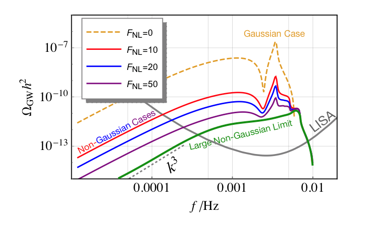 图3 暗物质全部由原初黑洞组成的情况下,原初标量扰动产生的诱导引力波。原初黑洞的质量取定为1022克,对应诱导引力波频率0.003赫兹。橙色虚曲线为高斯型的标量扰动诱导的引力波。红、蓝、紫曲线为不同的非高斯性的情况。苔绿色为极端非高斯(χ^2分布)的标量扰动诱导的引力波。可以看到固定原初黑洞的能量密度的情况下,增大非高斯会压低诱导引力波。但其能量密度的下界在下一代空间引力波探测器LISA/太极/天琴的敏感度曲线以上。