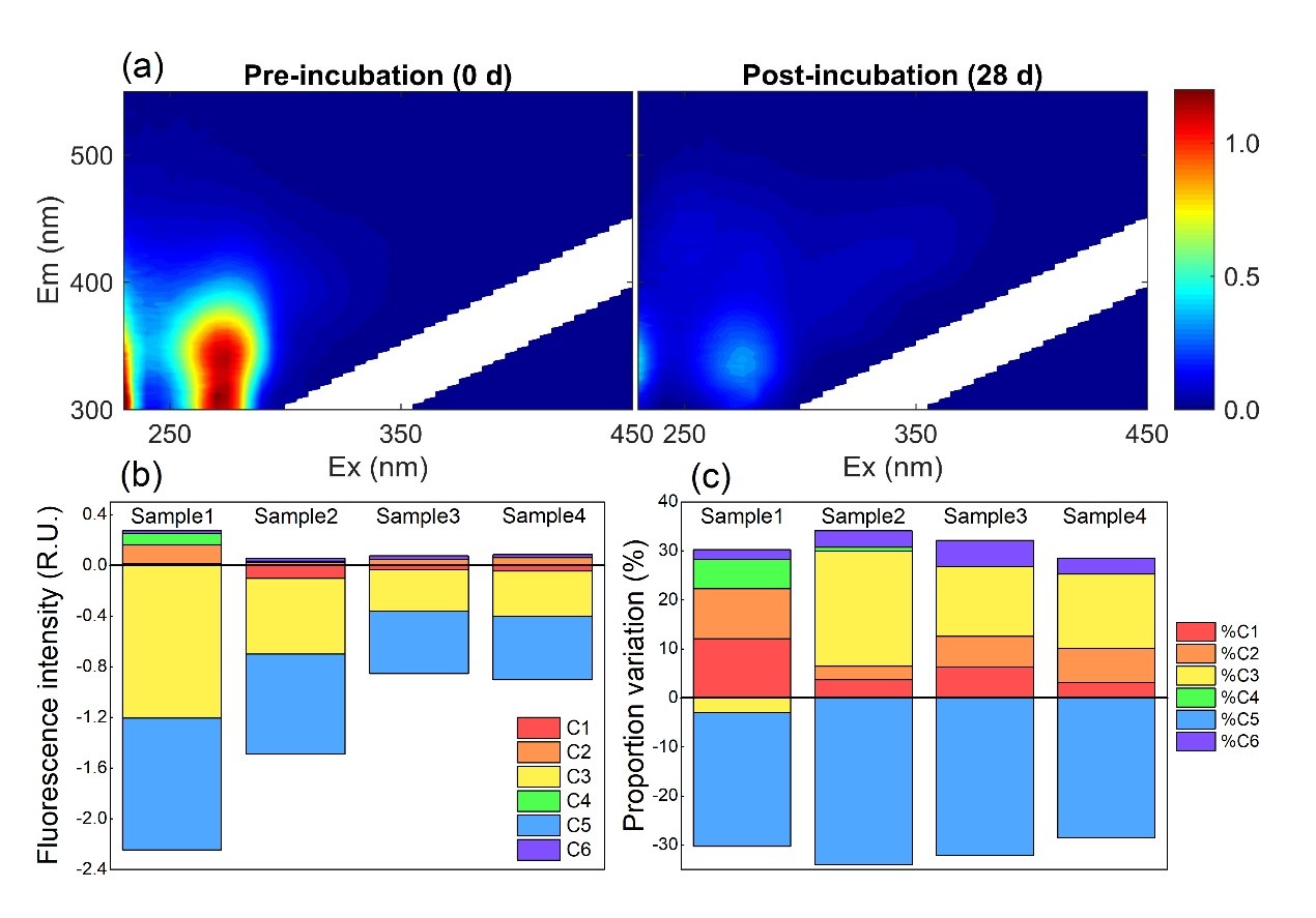 野外采样结果显示,由平行因子分析得到的4种类蛋白组分占全部6种荧光组分的86.0±11.9%,说明冰川有色DOM (CDOM)主要来源于微生物作用。超高分辨率质谱分析(FT ICR-MS)结果表明,与微生物来源相关的脂类和蛋白质(即高H/C)物质在冰川冰和融水样品中均有较大贡献。多元线性回归模型表明,细菌群落中相对丰度大于1%的门类分别解释了微生物作用类腐殖酸、陆源类腐殖酸和类蛋白组分变化的64.2%、61.3%和65.0%。基于网络分析确定了与不同类型荧光组分密切相关的细菌群落(图1)。此外,实验室生物培养实验证实,微生物主要消耗类蛋白DOM,并在这一过程中产生类腐殖酸物质,由此提高了培养后样品中类腐殖酸荧光组分占比(图2)。