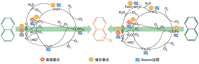 在本工作中,该团队通过模拟焚烧烟气反应氛围,以萘为模式化合物,研究了焚烧烟气中可能存在的Cu、Fe、Mn、Cr、Co、Ni、Al、Ti、Pb和Zn的氧化物和氯化物对芳构化和物亲电氯化的影响,发现铜(Ⅱ和Ⅰ)和铁(Ⅲ和Ⅱ)的氯化物是促进萘氯化的关键活性物质。结合铜铁粒子晶型结构变化分析,首次揭示了烟气中铜和铁粒子通过脱氯-氧氯化循环驱动芳构化合物亲电氯化的反应机制。氯化铜(Ⅱ)和氯化铁(Ⅲ)可作为氯化剂直接诱导芳构化合物氯化。在铜粒子的脱氯-氧氯化循环中,由氯化铜(Ⅱ)诱导的直接氯化是芳构化合物氯化的主要机制;在铁粒子的脱氯-氧氯化循环中,直接氯化和催化氯化发挥的作用相当。萘的亲电氯化符合电子云密度函数理论,1和4位点优先发生氯取代反应。