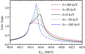 郭奉坤最近提出了一个全新的精确测量X(3872)的束缚能的方法,此方法甚至可以突破D*0和D0的质量测量误差(各仅为50keV)的限制,使得测量精度远超现有结果。方法的原理是:如图1所示,在高能粒子实验中产生一对正反D*0介子,其中一个(如D*0)放出一个光子辐射跃迁到基态的D0,D0再与反D*0发生反应产生X(3872)。在正反D*0介子对的质心系中,当总能量在一个特定区间的时候,D0介子的运动速度可以超过反D*0,如果它们沿同向运动,那么D0介子撞击反D*0从而产生X(3872)即可作为经典过程发生。此时,这个过程的振幅具有的所谓的三角奇点靠近物理区域,从而提升反应几率。该几率作为能量的函数(称为线形,实验上可测)对X(3872)的束缚能极其敏感(参见图2,其中为束缚能),从而可以通过测量X(3872)和光子的线形来精确确定X(3872)的束缚能。郭奉坤通过蒙特卡罗方法研究了要达到一定的测量精度所需要的事例数,发现利用该方法只需要几百个事例即可能将测量精度比现有结果提高一个量级。这一方法可以应用到任何可以大量产生S波正反D*0介子对的实验中,比如正负电子对撞、正负质子对撞等。