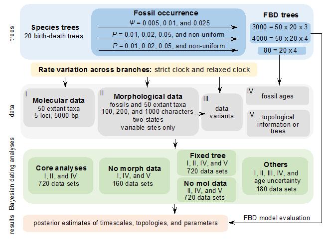 自Ronquist Fredrik等2012年正式提出以来,贝叶斯整合推断分歧时间方法得到了学界的高度关注,已经被应用到鸟类、鱼类、哺乳动物和植物等的进化历史研究中。然而,整合证据定年面临许多挑战,特别是化石取样和形态特征进化模型相关的挑战;其具体分析功效也受到一些质疑,如容易推算更加古老的历史时间。因此,中国科学院朱朝东研究组成员在已有生命之树工作基础上,加强与国内外同行合作,模拟基因和形态特征数据对tip-dating展开了系统评估。