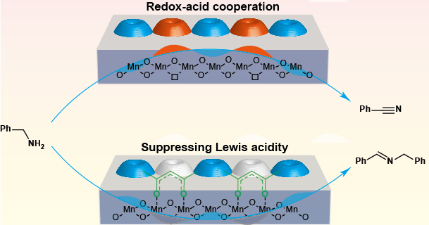 研究表明,通过不同结构的乙酰酮对锰氧化物表面进行修饰,可以调控锰氧化物表面的Lewis酸性。在催化氧化苄胺及其衍生物反应中,可分别实现高选择性制备亚胺或腈:例如锰氧化物未经修饰时,催化氧化苄胺主要得到有机腈产物,收率为86.5%;当用乙酰丙酮对催化剂修饰时,主要氧化产物为亚胺,收率可达到90.6%。该工作利用乙酰酮类化合物的络合能力,调变了锰氧化物表面Lewis酸性和催化氧化性能,对于深入理解金属氧化物表面与有机胺选择氧化的构效关系具有重要意义。