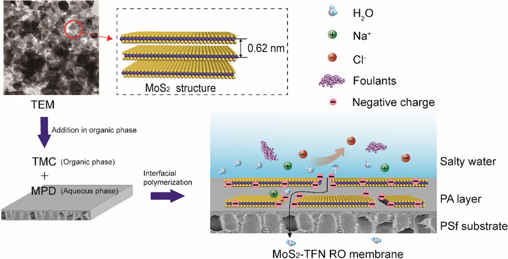 基于此,中国科学院城市环境研究所膜科学与技术研究组(张凯松研究团队)通过超声辅助溶剂剥离的方法大量制备了类石墨烯二硫化钼纳米片层材料。所剥离的二硫化钼纳米片层具有纳米级别厚度(2.2 nm),层数在2-3层,并具有较强的电负性。研究进一步以聚砜超滤膜为基膜,将制备的纳米片层添加在油相,通过含间苯二胺单体的水相和含均苯三甲酰氯单体的油相之间的界面聚合反应成功制备了反渗透纳米复合膜。透射电镜表征证明了纳米片层很好地分散在聚酰胺层基质中和膜表面。与普通膜和商业膜(BW-30)相比,所制备的反渗透纳米复合膜具有更高的水通量和盐截留率以及良好的抗蛋白污染性能。主要是因为纳米复合膜表面的亲水性得到了一定的提升,同时具有较强电负性的二硫化钼纳米片层使膜表面对于盐离子和带负电的污染物具有更强的静电排斥作用,从而实现了对反渗透复合膜通量和截留率的同步提升,以及较好的抗污染能力。