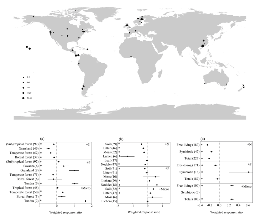 中国科学院华南植物园生态中心博士后郑棉海在研究员莫江明的指导下,通过收集和整合分析全球不同自然生态系统(热带/亚热带森林、温带森林、北方森林、草地和苔原)、不同基质(土壤、凋落物、苔藓、地衣、叶片和根瘤)和不同固氮类型(自由固氮和共生固氮)对养分(氮、磷和微量元素)输入的响应格局;同时分析养分添加措施(养分添加速率、持续时间和输入总量)和环境因子(温度、降雨和氮沉降)对以上这些响应格局的作用。研究表明,氮添加抑制生态系统生物固氮(-19%),微量养分添加促进生态系统生物固氮(+30.4%),而磷添加对生物固氮的影响取决于生态系统、基质和固氮类型。研究进一步发现中高纬度生态系统生物固氮对养分输入的响应(32.9-61.3%)比低纬度生态系统的响应(8.5-36.9%)更敏感,并且中高纬度生态系统生物固氮的响应随着纬度降低而减弱。此外,研究还揭示了养分添加措施没有影响生物固氮的响应,但环境因子显著影响生物固氮对养分输入的响应;即随着温度、降雨量和大气氮沉降速率的增加,中高纬度生态系统(低温、低降雨和低氮沉降区域)生物固氮对养分输入的响应减弱。