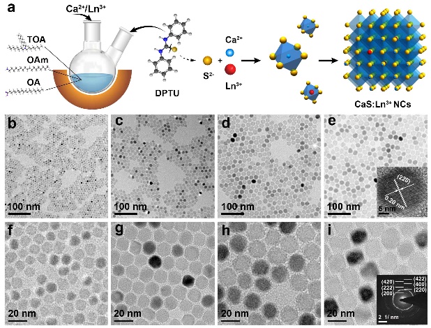 图1 稀土掺杂CaS NIR-II纳米荧光标记材料:a)合成示意图, b-i) 通过改变油酸(OA)/油胺(OM)比例制备不同粒径CaS:Ce3+纳米晶的透射电镜、高分辨透射电镜和选区电子衍射图