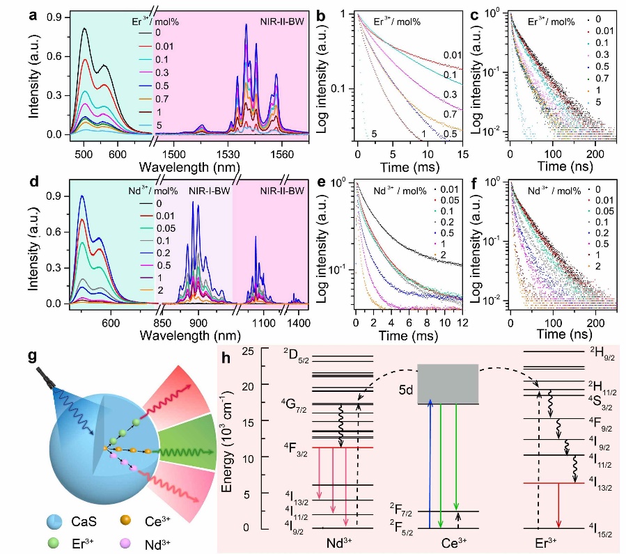 图2 CaS:Ce3+/Er3+和CaS:Ce3+/Nd3+ NIR-II纳米荧光标记材料: Er3+浓度相关a)发射光谱, b) Er3+荧光衰减曲线和c) Ce3+荧光衰减曲线;Nd3+浓度相关d) 发射光谱, e) Nd3+荧光衰减曲线和f) Ce3+荧光衰减曲线;g, h) 能量传递示意图
