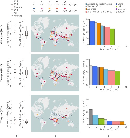 图1 生活污水氮磷排放的时空格局:(a)全球排放总量;(b)五大洲173个国家的氮磷排放量;(c)典型区域和国家的人均生活污水氮排放水平