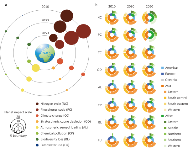图2 基于地球环境容量阈值的污水氮磷减排及其环境影响:(a)全球尺度;(b)洲际尺度
