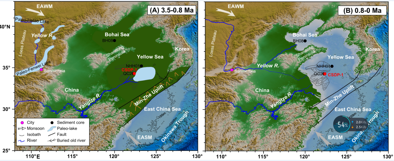 国际地学刊物《第四纪科学评论》(Quaternary Science Reviews)6月13日在线刊发了中国科学院海洋研究所研究员万世明(通讯作者)和博士研究生张晋(第一作者)与美国路易斯安那州立大学、南京大学、同济大学、自然资源部第一海洋所、青岛海洋地质所等单位合作的最新研究成果“History of Yellow River and Yangtze River delivering sediment to the Yellow Sea since 3.5Ma: Tectonic or climate forcing?”。科研人员通过南黄海盆地三百米钻探岩芯的沉积记录研究发现,黄海在过去350万年前-80万年前之间长达270万年的时间里主要是陆相盆地,从80万年前以来才发生了大规模海侵而成为黄海,同时黄河开始贯通注入南黄海,这主要归因于青藏高原东北部在晚上新世-更新世的隆起和中国东部沿海及闽浙隆起带的构造沉陷。