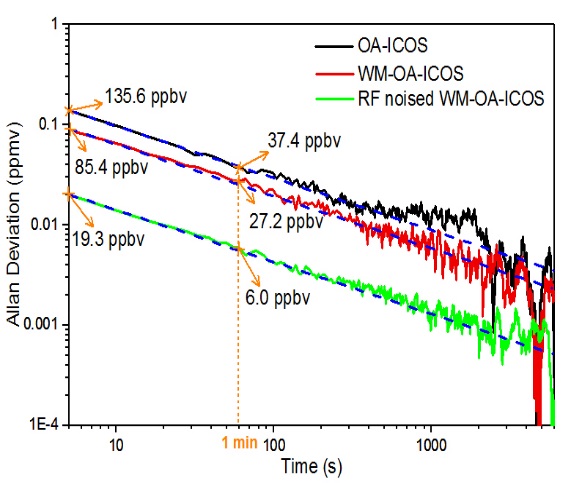 近日,中国科学院合肥物质科学研究院安徽光学精密机械研究所高晓明课题组在提高离轴积分腔输出光谱仪器性能方面取得新进展,相关研究成果以《波长调制和白噪声扰动实现高灵敏度的离轴积分腔输出光谱技术》(High-sensitivity off-axis integrated cavity output spectroscopy implementing wavelength-modulation and white noise perturbation)为题发表在国际学术期刊Optics Letters上。