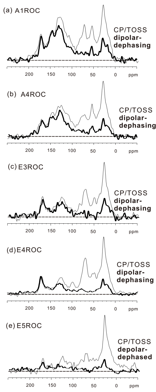 图1 13C NMR 编辑技术用于鉴定ROC组分中的不同官能团:细线,非选择性CP/TOSS谱图;粗线,对应的偶极去相CP/TOSS谱图(来源:ScienceDirect)