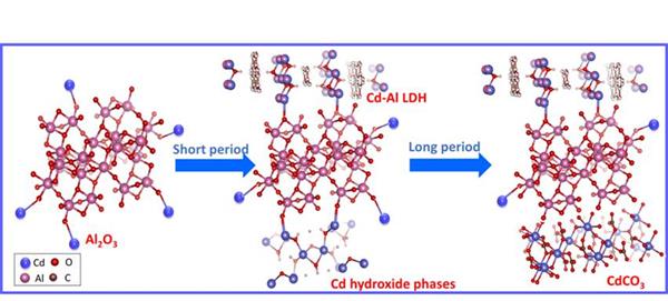 研究发现Cd在氧化铝表面除了形成表面络合物外,还会形成氢氧化镉多聚物,后者会逐渐转化为碳酸镉。XRD、HR-TEM和EXAFS结果表明,Cd在氧化铝表面能形成Cd-Al层状双金属羟基化合物(LDH)沉淀(图1)。Cd(II)在含铝矿物表面形成LDH沉淀这一现象十分有趣,因为这一现象多发于半径和Al(III)相似的阳离子,对于半径比Al(III)大得多的阳离子如Cd(II),则从未被发现。该研究结果表明吸附-沉淀过程控制着Cd在含铝矿物表面的固定,建议在预测镉的环境行为、评估镉的环境风险时应考虑镉的沉淀过程。此外,含铝矿物表面形成热稳定的Cd-Al LDH沉淀也为镉污染场地土壤修复提供全新视角。相关结果发表于Environment International (2019, 126: 234-241)。