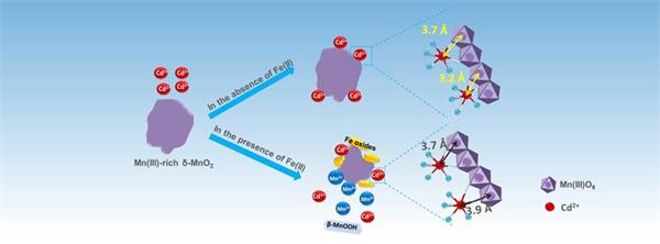 土壤中的氧化锰因具有大量的表面缺陷和负电荷,对镉亦具有很强的固定能力。然而,在氧化-还原交替地带,常会有一些还原性物质如Mn(II)和Fe(II)与氧化锰共存,这些还原性物质会改变氧化锰的性质,进而影响氧化锰对Cd(II)的固定机制。研究发现,Mn(II)的加入抑制了Cd(II)的吸附并使Cd(II)从氧化锰的空穴位转移到边缘位,形成双齿双核的吸附构型;当环境条件偏碱且Mn(II)浓度较高时,会引发Cd(II)-Mn(III)沉淀的产生(图2)。而当Fe(II)加入到氧化锰中时,Fe(II)被迅速氧化,形成大量的水铁矿覆盖在氧化锰表面,堵塞氧化锰的吸附位点,并改变Cd(II)的吸附构型(图3)。研究结果为揭示农田土壤中Cd形态转化提供了理论支撑,为发展锰基修复剂提供了技术支撑。相关结果发表于Chemical Engineering Journal (2018, 353, 167-175) 和Environment International (2019, 130: 104932)。