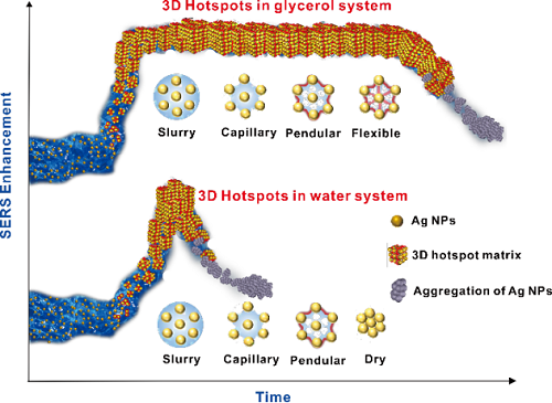 前期,杨良保课题组通过溶剂蒸发诱导纳米粒子自组装,发展了一种动态表面增强拉曼光谱(D-SERS) 方法——利用溶液蒸发过程中形成的三维热点矩阵,实现SERS的高灵敏响应。然而,由于水溶液蒸发速率快速,导致三维热点时间短,稳定性差。因此,针对这些问题,杨良保等提出了一种利用甘油构建长周期、高稳定表面增强拉曼三维热点矩阵的方法。该方法使三维Ag NPs热点矩阵数量增加,SERS检测灵敏度大大提升,实现了纳摩尔水平海洋生物毒素、农残、毒品等的高灵敏、稳定检测。构筑的长周期、高稳定三维热点,减少了由水体系热点存在时间短而引起的偶然因素的发生,使实验更具可操作性,在实际犯罪现场分析、医学诊断、食品安全等诸多领域的应用前景更加广阔。