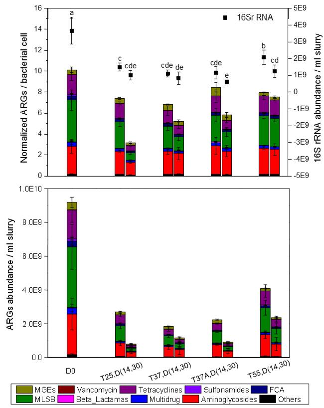 图1 厌氧消化过程抗生素抗性基因和16S rRNA基因丰度变化。D,T和A分别代表天数,温度和抗生素。