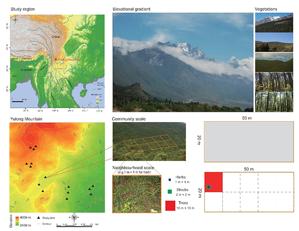 云南西北部地处我国三大河流(怒江、澜沧江和金沙江)的上游,区域内有三江并流世界自然遗产地和众多的自然保护区。由于其复杂的地质、气候历史和多样的地形地貌,造就了其富有特色的生物多样性。该地区位于全球生物多样性的热点地区“中国西南山地”的核心区域,是气候变化最为敏感和脆弱的地区之一。玉龙雪山沿海拔梯度存在多种气候类型,植物种类繁多,呈现出较为完整的山地植物垂直带谱,是滇西北植物多样性的缩影,也是我国重要的生态安全屏障,具有重要的生态系统服务功能。区域内的森林群落垂直结构明显,林下拥有丰富的植物多样性,为研究森林生态系统功能提供了天然的场所。中国科学院昆明植物研究所植物多样性演化和生态适应团队高连明研究组和植物多样性与基因组学团队李德铢研究组依托丽江森林生态系统定位研究站,于2013年开始,在丽江玉龙雪山建立了沿海拔梯度的森林群落样带,旨在开展全球变化生态学和群落生态学研究,以期揭示自然状态下真实的森林生物多样性与生态系统功能的关系。