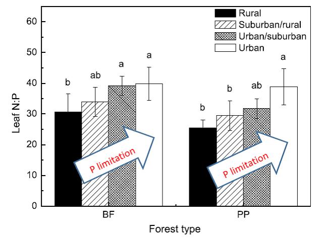 中国科学院华南植物园生态中心黄娟、莫江明研究团队以珠三角的农村-城市梯度为试验平台,选取该地区两种典型森林类型(常绿阔叶林(BF)和马尾松针叶林(PP))为研究对象,研究了植物的氮(N)、P等养分元素含量及其比值、微生物群里组成及其丰度等指标。结果发现,两种森林类型的植物叶片N:P比值均很高(20-50),并且随农村-城市梯度显著增加;暗示森林生态系统的P限制沿城市化进一步加剧。土壤革兰氏阴性菌和放线菌的丰富均随农村-城市梯度而下降,支持P限制加剧对土壤微生物的负面影响。然而,城市化诱导森林生态系统P限制加剧的主要途径依森林类型而变化。在BF,阔叶树通过叶片直接吸收来自城市化过程中的氮沉降是主要途径;在PP,氮沉降诱导的土壤酸化是主要途径。该研究结果为研究城市化对森林健康的影响及森林管理等方面提供科学依据。