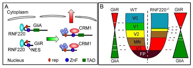 RNF220是中国科学院昆明动物研究所毛炳宇课题组鉴定的一个泛素连接酶,但其在神经发育中的功能与作用机制尚不清楚。在该研究中,作者首先证实RNF220在小鼠胚胎腹侧神经管特异性表达,发现在RNF220敲除小鼠胚胎中,背侧神经管发育正常,而腹侧神经管的图式形成发生紊乱:腹侧的V3神经区域向背侧扩张,神经管中部的V0神经向腹侧扩张,而位于V0和V3之间的V1、V2与运动神经元不同程度地被挤压,V1、V2神经元几乎消失。根据目前的模型,这种独特的表型意味着Shh信号梯度可能发生了变化。作者通过激光显微切割结合实时定量PCR实验技术,证实了这一推测,提示RNF220可能直接参与了Shh信号的调控。在分子机制上,作者通过体内体外实验,证明了RNF220与Shh信号的效应因子Gli相互作用并可以促进其泛素化。进一步研究发现,RNF220介导的Gli泛素化是K-63连接的,这种修饰会引起Gli的出核转运,并鉴定了参与这一调控过程的Gli出核转运信号序列。RNF220对Gli的这种调控效应对于GliA和GliR都是成立的,从而降低细胞核内有效的Gli水平,维持适当的GliA和GliR的活性梯度,最终参与神经细胞分化的调控。