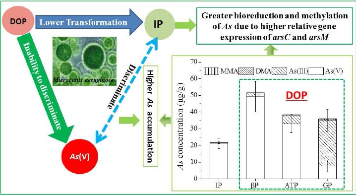 当前涉及溶解有机磷(DOP)对生物体中砷酸盐(As(V))生物积累和生物转化的影响研究相对较少,不利于砷地球化学循环的全面理解和调控。为此,中国科学院城市环境研究所颜昌宙研究组副研究员罗专溪与闽南师范大学副教授王振红、美国麻省大学阿默斯特分校教授邢宝山等开展合作研究,选取了三种不同的有机磷源(β甘油磷酸钠(βP)、三磷酸腺苷(ATP)和葡萄糖磷酸钠(GP))与无机正磷酸盐(IP)相比较,探讨不同磷源下铜绿微囊藻对As(V)的毒性效应、累积与生物转化的差异,并试图在亚细胞分布水平和基因表达方面进行科学解释。研究结果发现:铜绿微囊藻在IP环境下对As(V)耐受性更高,这与该条件下藻体磷(P)在金属敏感组分(MSF)中的较高分布相一致。DOP环境下铜绿微囊藻中砷在MSF组分中分布较高,可较好解释该环境下砷的较高毒性与敏感性。同时发现IP环境下铜绿微囊藻对As(V)和P有较好识别,但在DOP环境则没有观察到这种识别。DOP环境特别是βP时可显著提高藻体对砷的累积;而GP则明显促进了砷的还原与甲基化,这得到了GP环境下藻体砷还原与甲基化功能基因(arsC和arsM)相对表达量较高的良好印证。研究结果为科学深入地了解环境中DOP如何调控微藻砷转化提供了新思路。