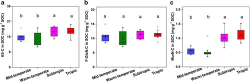 图1 四个气候带水稻土中总氨基糖(总残留物)、氨基葡萄糖(真菌残留物)和胞壁酸(细菌残留物)来源碳对有机碳积累的贡献