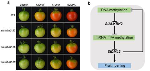 (a) m6A去甲基化酶基因SlALKBH2突变体表型;(b) DNA甲基化和m6A共同调控果实成熟