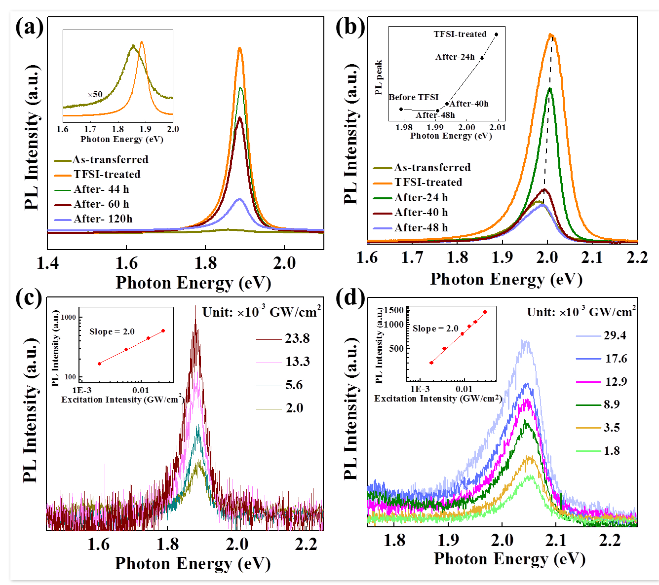 为解决MoS2和WS2的双光子荧光泵浦效率过低的问题,研究缺陷态对光子吸收和载流子驰豫复合的问题,科研人员以TFSI溶液处理过后的样品为实验组,未处理的为参照组,样品为化学气相沉积法的单层MoS2和WS2。实验中,处理后未观察到明显的形貌变化,硫钼比高于未处理组,表明硫空位已得到修复。