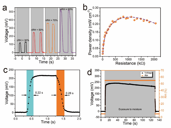 图3. a. g-PDA柔性自供能器件在ΔRH分别为30%, 50%, 70%,和 90%时产生的开路电压信号。b. g-PDA自供能器件在不同外接电阻下的有效输出功率(ΔRH=90%)。c. g-PDA自供能器件对湿气的响应和恢复时间(ΔRH=50%)。d. g-PDA自供能器件在恒定ΔRH=50%条件下的开路电压信号。