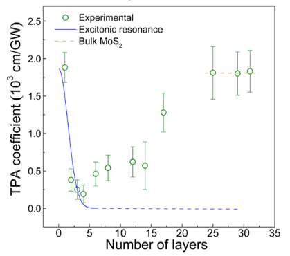 二维过渡金属硫化物由于面内具有非常强的量子限制效应,使得受激发的电子-空穴对的库仑相互作用很强,从而表现出独特的非线性光学特性,包括高次谐波产生、超快饱和吸收、光学限幅、多光子吸收等。然而,带隙大小随层数的调制和激子效应对材料非线性吸收的影响等问题一直困扰着这些材料发展,限制了它们在微/纳米光调制器、光开关和光束整形器件中的应用。