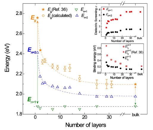 图2 MoS2中准粒子带隙(Eg)和A激子的第一激发态(En=2)随层数的变化关系