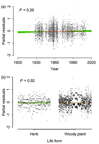 为检验这一假设,中国科学院昆明植物研究所研究员杨永平带领的植物基因组演化与基因功能发掘团队与中国科学院植物研究所、云南师范大学、云南大学和西藏自治区高原生物研究所合作,查阅了存放于昆明植物所标本馆(KUN)和植物所(PE)的2万余份豆科植物标本,记录了每份含果实标本上一个果荚内的种子数量,在经过去除重复、去除自交物种、去除因样本量小而无统计意义的数据后,共获得了109种豆科植物4637个关于种子数量的数据,这些标本最早采于1900年,最新采于2013年,时间跨度超过30年的物种为101个。统计结果表明,只有13个物种的种子数量在近些年表现出了显著的变化趋势,其中9个物种的种子数量显著增加;三个亚科植物的种子数量并没有表现出一致的变化趋势,而在蝶形花亚科中,种子数量增加的物种数要高于降低的物种数。显然,该研究结果表明豆科植物与传粉者的相互关系在近些年来并没有被严重干扰,至少在中国是这样的情况。该研究一方面表明植物与传粉者的相互关系比人们想象的要更加复杂,而另一方面则为如何利用标本数据开展研究提供了一个新的思路。