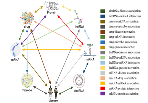 图2.人类大规模异构生物分子关联网络中分子关联关系类型