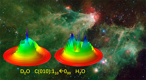 水分子广泛存在于宇宙中,其与真空紫外光相互作用是高反应活性星际物质OH的重要来源。量子态水平研究水分子光化学过程对于建立星际化学模型,以及同位素解离不同动力学研究对于理解星际中H/D分布的不均匀性都具有深刻意义。该团队对H2O分子和D2O分子经由C(010)初始态解离动力学进行了转动量子态分辨的高精度实验研究。观测结果显示,与OD+D光化学过程相比,OH+H产物量子态分布受偶然共振机理影响强烈,可以经由非绝热耦合路径解离。该研究对于涉及多达五个电子态势能面的复杂解离过程,提供了一个重要的态-态非绝热耦合多路径竞争解离的例子。