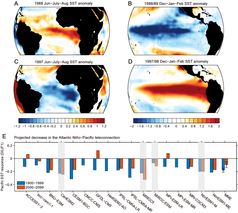 大西洋尼诺(也称为大西洋纬向模态)是赤道大西洋年际变异的主模态,表现为年际尺度上赤道东大西洋海温异常增暖(称为大西洋尼诺)或变冷(称为大西洋尼娜),且异常峰值出现在北半球夏季(6月-8月)。大西洋尼诺(尼娜)可通过加强(减弱)沃克环流,促进当年冬季太平洋拉尼娜(厄尔尼诺)的发展,从而成为厄尔尼诺-南方涛动(ENSO)的有效预测因子。极端ENSO事件因其海温异常的强度大,会对全球气候、生态系统和农业等产生显著影响。而1900年以来的三次极端厄尔尼诺事件(1982/83、1997/98和2015/16厄尔尼诺),都伴随有夏季的大西洋尼娜事件;两次极端拉尼娜事件(1988/89和1998/99拉尼娜),也都与夏季的大西洋尼诺有关。随着全球变暖,大西洋尼诺与太平洋及ENSO的关联如何变化,目前尚不清楚。