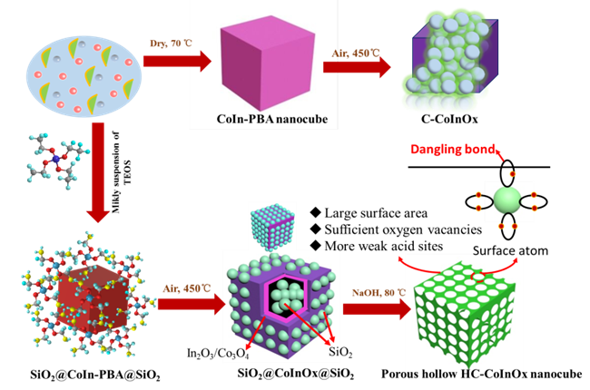 该研究团队采用原位硬模板法实现了模板剂、金属纳米粒子和有机配体在溶液中有效的自组装(图1),成功制备了中空结构的HC-CoInOx多孔纳米立方体双金属氧化物催化剂,该催化剂可有效降低甲苯完全催化燃烧的反应温度,同时具备良好的热稳定性。