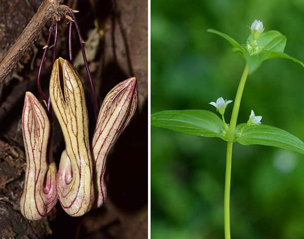 左:杨氏马兜铃 Aristolochia yangii(发现于云南保山,图片:朱鑫鑫);右:大籽假龙胆 Gentianella macrosperma(发现于新疆伊犁,图片:亚吉东)