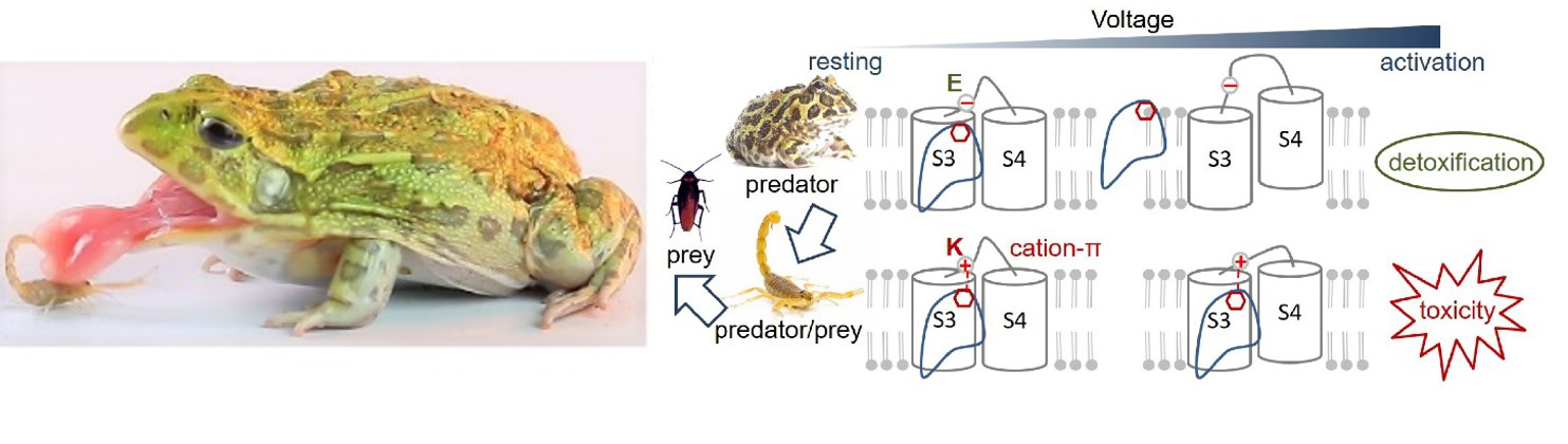 有趣的是,研究人员发现一些食蝎两栖类无尾目在食物链中处于比蝎子更高等的捕食地位,它们高度耐受蝎毒,在捕食蝎子的过程中不发生运动系统的异常。基于上述的分子相互作用原理,研究人员揭示了食蝎的蛙类自身Nav1.4关键残基(1432K-E)的突变,使α毒素无法与其结合并发挥作用。受体的进化赋予食蝎蛙类抵御蝎毒的能力,巧妙化解了蝎子的生化武器。该研究还提示,类似毒素-受体共同进化和相互博弈的机制和动态变化构成了产毒动物食物链演化的最基本元素。