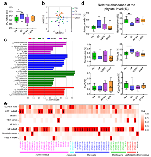 图1 低温改变布氏田鼠的肠道菌群结构和调节产热功能。(a) Alpha多样性;(b) 基于未加权Unifrac距离算法的NMDS图;(c) LEfSe分析鉴定不同组中的差异标志菌;(d) 门级水平上的相对丰度;(e) 特定OTU与生理指标的相关关系。