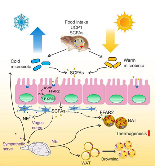 冬季的严寒和食物短缺对于温带地区非冬眠哺乳动物的生存是极大的挑战。恒温动物维持高而恒定的体温需要付出很高的代价。褐色脂肪组织(brown adipose tissue, BAT)产热(非颤抖性产热)是一种高效迅速的产热方式,受交感神经支配,在小型哺乳动物(包括冬眠动物)的体温调节中发挥关键作用。当动物受到寒冷等信号刺激时,支配BAT的交感神经末梢释放去甲肾上腺素,去甲肾上腺素通过作用于BAT细胞膜上的β3肾上腺素能受体,激活蛋白激酶A信号通路,即cAMP-PKA-pCREB通路,诱导线粒体内膜上的产热蛋白——解偶联蛋白1(uncoupling protein 1, UCP1)的表达,提高非颤抖性产热能力,维持恒定的体温。动物体内的肠道微生物是否参与了动物的体温调节和代谢产热过程呢?