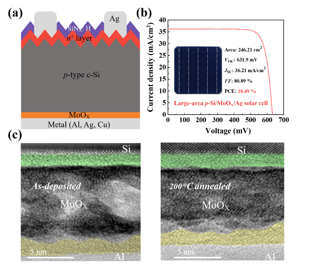 (a)p-Si/MoOX/金属电池结构示意图;(b)p-Si/MoOX/Ag大面积电池的J-V曲线;(c)退火前后Si/MoOX/金属界面电镜图。