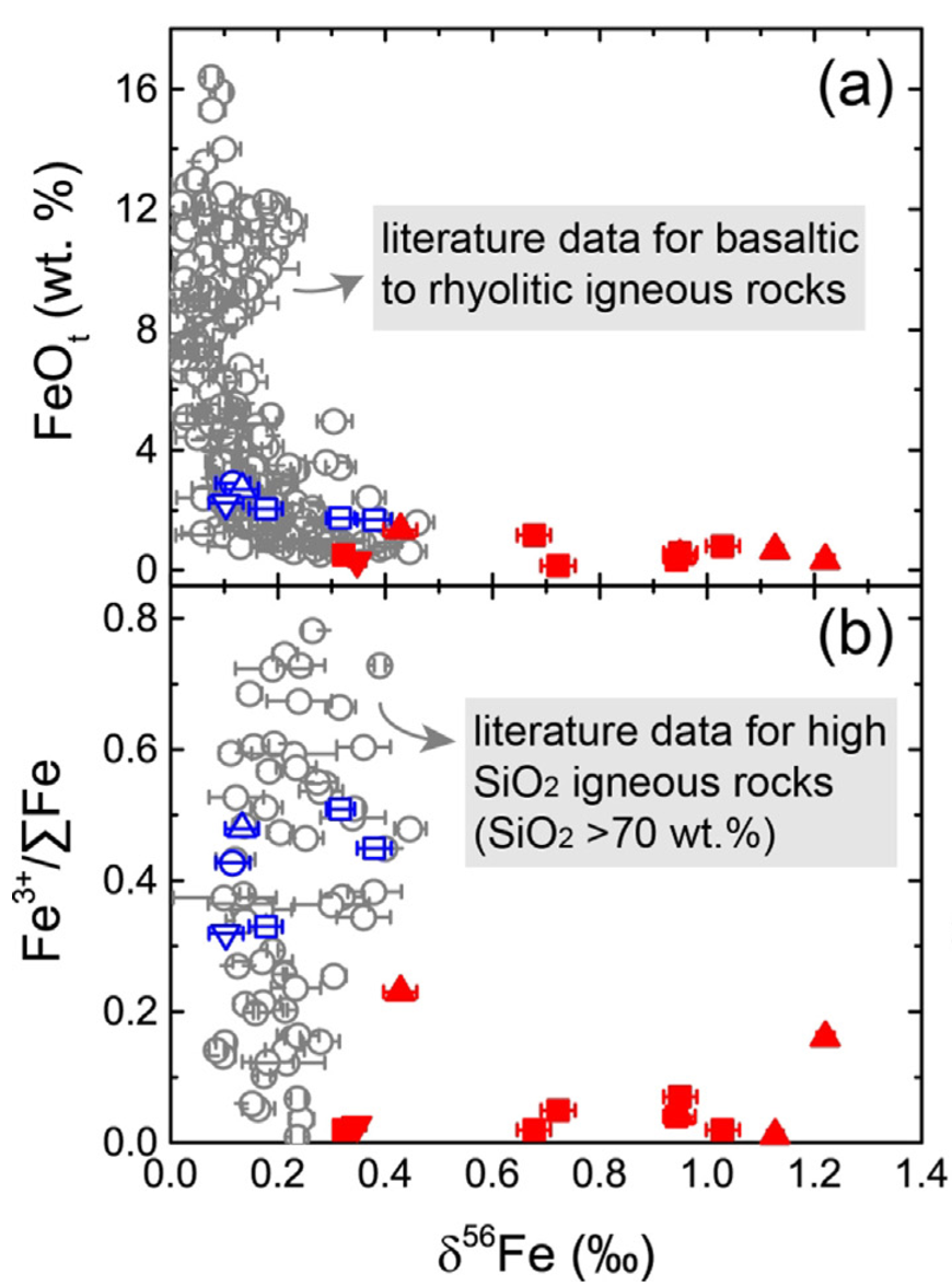 近期该团队针对白片岩Fe同位素的分析结果揭示,其具有全球高温岩石中最重的Fe同位素组成(δ56Fe高达1.22‰)。其Fe同位素组成明显不符合火成岩的岩浆演化趋势,指示了俯冲带流体交代过程的影响(图1)。全岩FeOt含量和Fe3+/∑Fe数据指示,交代过程中原岩变花岗岩总Fe含量和Fe3+/∑Fe比值都显著降低,但Fe同位素组成显著变重(图1)。