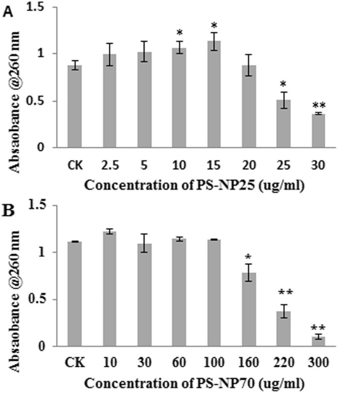 图1. 不同浓度聚苯乙烯纳米微球对A549细胞活力的影响