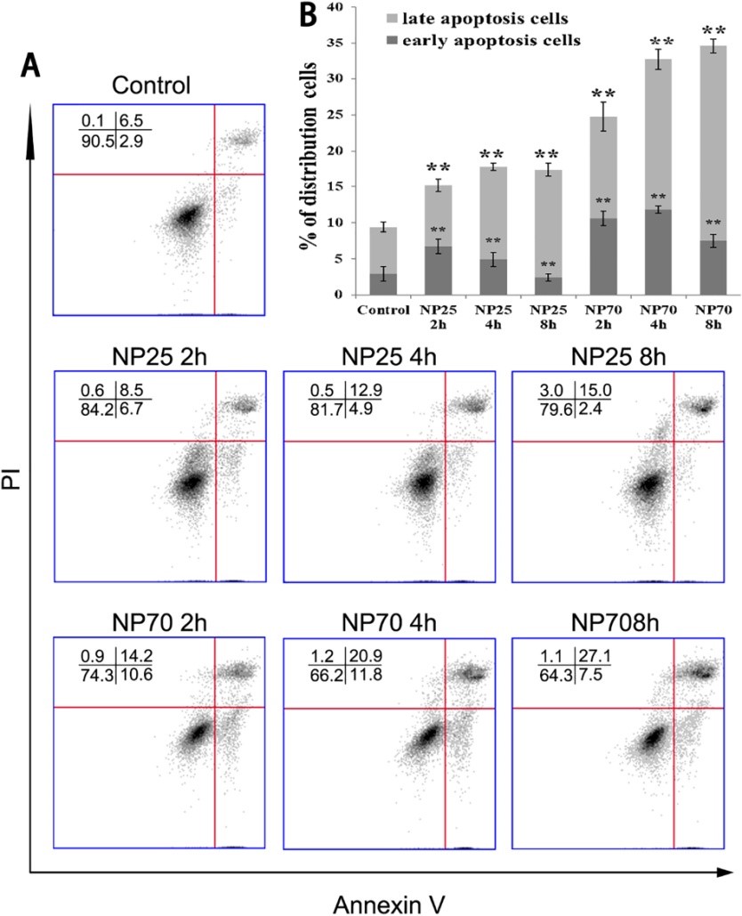图2. 通过流式细胞仪观察到聚苯乙烯纳米微球可以诱导A549细胞产生凋亡现象