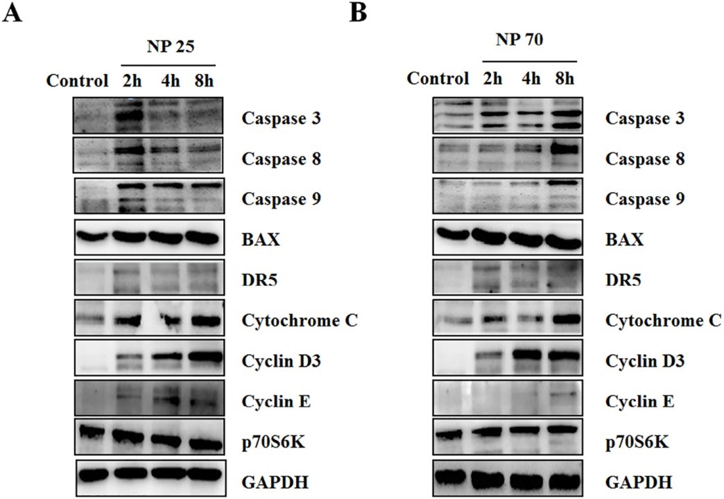 图3. 聚苯乙烯纳米微球可以改变A549细胞中细胞周期表达和凋亡调控相关蛋白