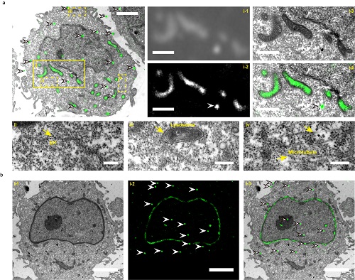 图:线粒体基质(a)和核纤层蛋白(b)的超分辨光电关联成像结果