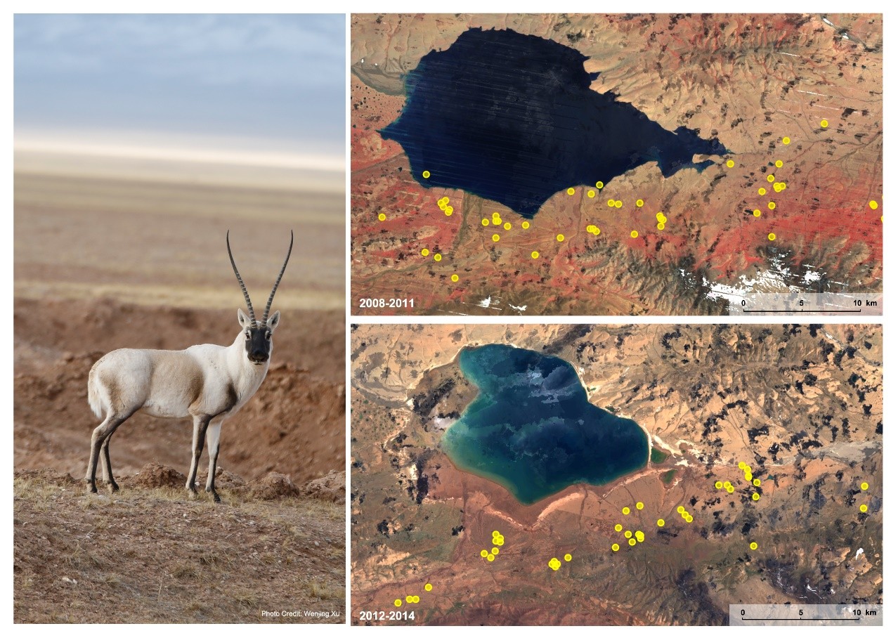 研究基于空天院博士郭新磊对于青藏高原野生动物保护的长期关注,在研究员牛铮和副研究员王力的指导下,裴杰等利用2008年至2014年6-7月30米美国陆地卫星(Landsat TM/ETM+/OLI)合成影像,分析了卓乃湖溃堤前后水体面积变化。遥感解译结果显示,溃堤后,湖水面积减少40%以上。卓乃湖湖岸线大幅退缩,土地沙化严重,直接导致藏羚羊生存环境恶化,同时饮水距离增加。研究进一步结合加州大学伯克利分校环境系博士徐雯靓提供的同时期藏羚羊活动点数据,直观地显示了卓乃湖溃堤对于藏羚羊种群活动的影响。