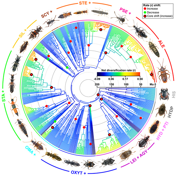 隐翅虫总科(昆虫纲:鞘翅目)是动物界最大的类群之一,已知约7万种。然而,现有研究对于隐翅虫总科物种多样性的起源并没有非常令人信服的解释。目前关于甲虫多样性起源的假说(例如与被子植物共辐射假说)大多适用于植食性甲虫,对隐翅虫这类非植食性甲虫的物种多样性形成机制的解释并不充分。