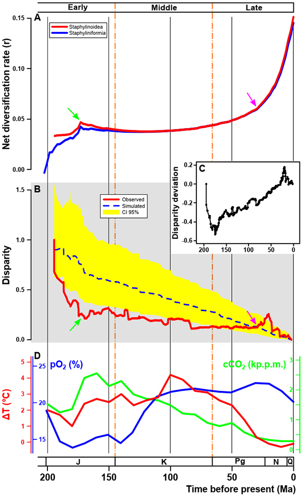 近日,中国科学院动物研究所周红章研究组通过考察隐翅虫总科的进化模式和古气候变化的关系,进而探究影响该类群当前多样性格局形成可能的宏观气候因素。该研究综合使用了664个现生物种(包括外群)6个基因的分子序列、5364种隐翅虫的体长数据库、约7万种现生隐翅虫的物种数据库,以及多达50个不同地质时期的化石定年数据参加分析。结果显示隐翅虫总科的历史大约可以追溯到三叠纪与侏罗纪交界的时期,其高级分支在侏罗纪中期和新生代早期经历过相对集中的快速辐射,而这两次快速辐射都发生在“低能量气候环境”(low-energy conditions)下。在侏罗纪的辐射中,气候因子(特别是低氧和高二氧化碳环境)促进了隐翅虫总科的物种分化和体型分化。在新生代辐射期,这一格局发生了变化,气候因子与物种分化速率呈负相关,而与体型分化的关联却非常微弱。该研究结果不支持隐翅虫总科的辐射与“白垩纪陆地生态系统革命(Cretaceous Terrestrial Revolution,KTR)”有直接的关联,即隐翅虫总科与被子植物没有直接的共辐射关系。相反,该研究认为占据与森林枯落物相关的环境作为“庇护所”并在其间不断分化的假说能够更好地解释隐翅虫总科在“低能量环境”下的快速辐射,以至于形成当前的分类多样性(taxonomic diversity)格局。