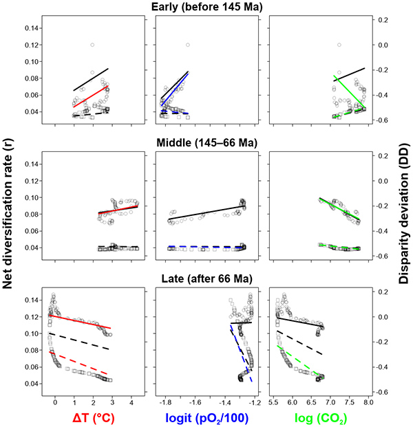 图3. 利用广义最小二乘回归模型分析净分化速率(r)和体长变化(DD)分别与温度、氧含量、二氧化碳浓度3个气候因子的关系