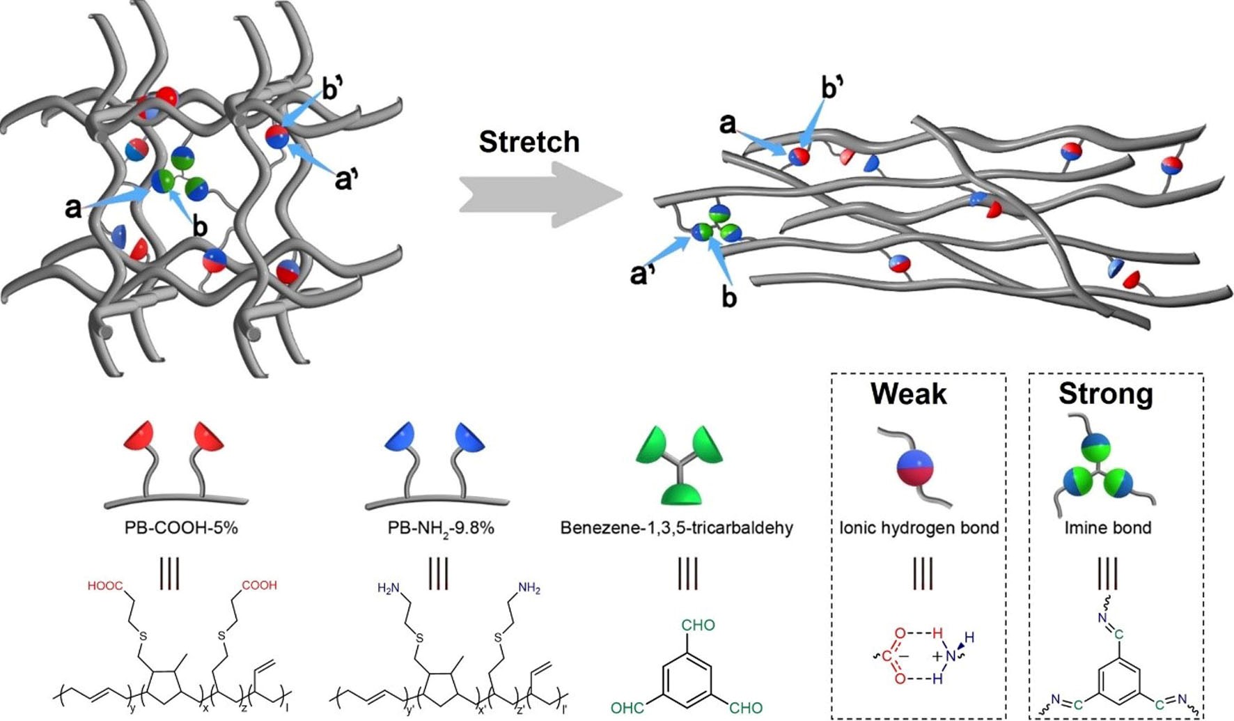 中国科学院化学研究所研究员赵宁课题组提出强、弱动态键协同作用获得超拉伸性能的策略。他们采用较弱的离子型氢键和较强的亚胺键交联聚丁二烯(PB),在拉伸过程中,少量的亚胺键用于维持网络结构,避免发生不可逆破坏,而大量的离子型氢键则耗散能量。这两种机制的协同作用使交联PB的最大拉伸倍数超过13000倍(受仪器量程限制和重力对拉伸性能的影响,尚未达到极限拉伸倍数),这一结果远超过文献报道的高拉伸聚合物(凝胶约210倍,本体聚合物约180倍)。